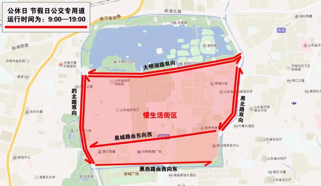 黑西路南侧由西向东车道、趵北路双向中间第二排车道、明湖路双向两侧车道、黑北路双向两侧车道以及泉城路北侧由东向西车道为节假日公交专用道。