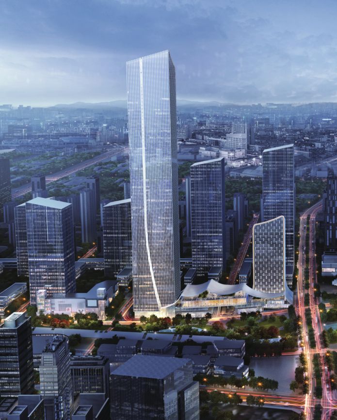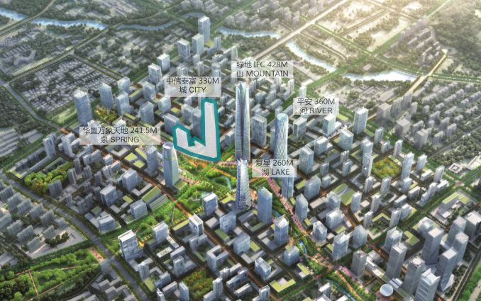 “城”由中信泰富开发,主塔楼地上约65层,高度约为330米,副塔楼地上约25层,高度约为120米,主副塔楼主要功能均为商务办公。