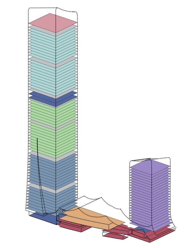 建筑方案由Aedes公司设计,设计概念为“古今之城”,意在模仿古城中错落的坡屋顶韵味,形成古与今的呼应与对比。