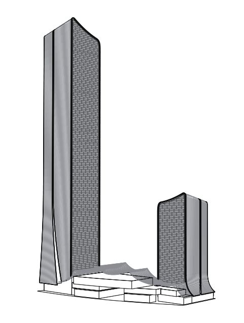 建筑以魏晋南北朝时期东城与西城的双子城格局为出发点,打造相互呼应但各具特色的双塔,呼应历史上济南城市的格局。设计将街墙寓意为城墙,把中央“城门”打开,形成视觉通廊,连接了场地东侧尽端道路与绸带公园。建筑檐口融合了中国传统建筑的弧形屋脊做法,形成连续错落的屋顶,再现明府城中当年的盛景。建筑立面采用水与城砖结合的造型,用抽象的方法固化古代城池记忆。城墙上由大至小的城砖呼应在立面上,层层渐变。